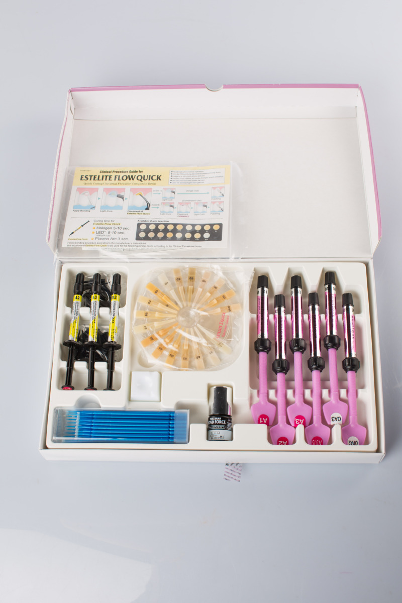 6 шприцев Estelite Sigma Quick по 3,8 г/2 мл оттенки - А1, А2, А3, А3.5, ОА3, ОРА2 и 3 шприца Estelite Flow Quick по 1,8 г оттенки - А2, А3, ОА3; адгезив Tokuyama Bond Force II - 5 мл, палета для адгезива - 1 шт., палитра цветовая пластиковая - 1 шт., микроаппликаторы - 50 шт., наконечники для шприцев - 27 шт.
