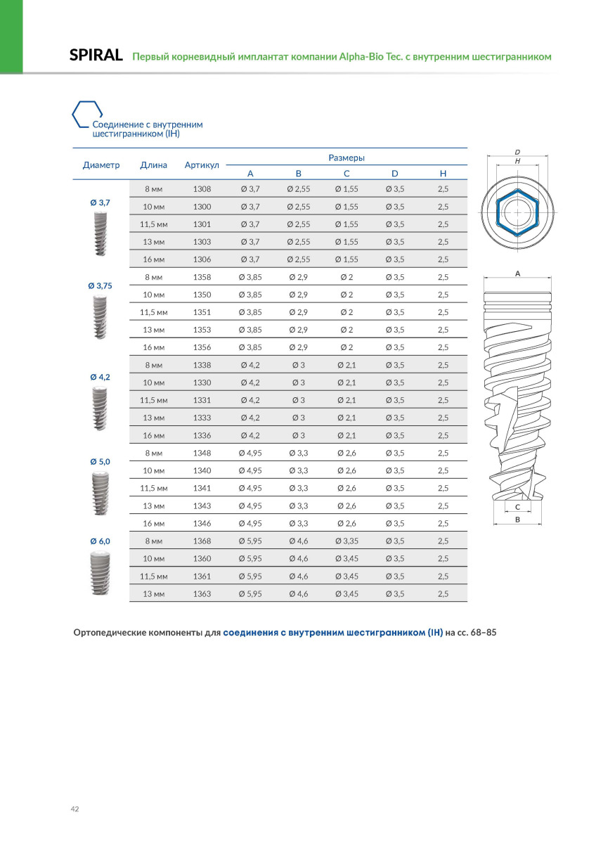 Конструкция имплантата Spiral™ включает в себя внутреннее шестигранное соединение, доступен выбор из широкого круга диаметров и длин имплантата.
