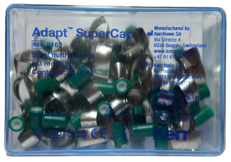 SuperMat и Adapt SuperCap Matrix - это универсальная система натяжения пластмассовых и стальных матриц в области жевательных зубов для быстрого, легкого и стандартизированного использования. Имеются матрицы 2 размеров по высоте с неизменяющейся формой для моляров и премоляров, изготовленные из стали или прозрачного пластика. Матрицы предварительно смонтированы на катушках SuperCap, являющихся средством натяжения системы SuperMat.