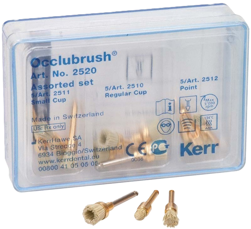 Occlubrush™ – это щеточки, использующиеся для быстрой полировки до зеркального блеска окклюзионных и вогнутых поверхностей реставраций из композитов, компомеров, стеклоиономеров и керамики, а также для профилактической обработки.