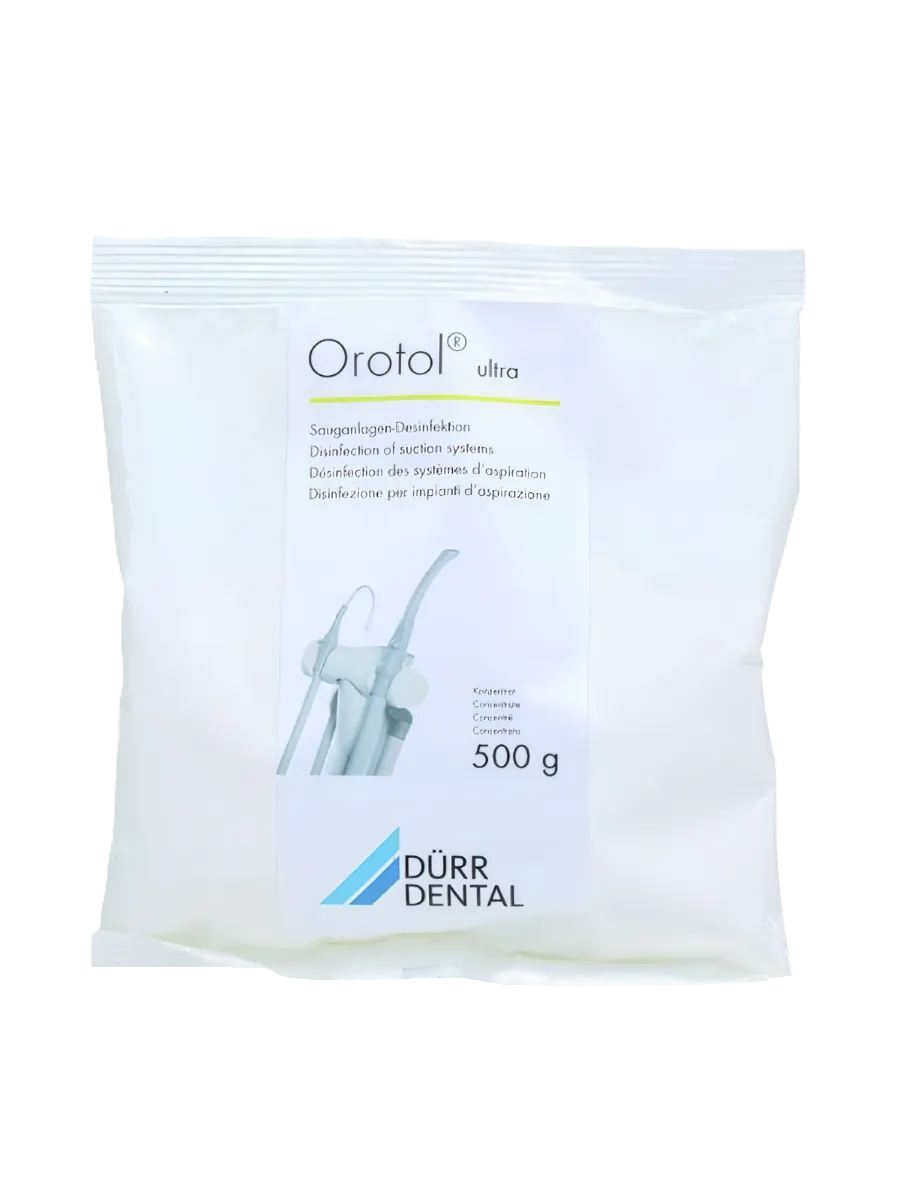 Оротол ультра - порошок для очистки и дезинфекции системы отсасывания (аспирационных систем). Предназначен для дезинфекции, чистки и дезодорирования стоматологических отсасывающих систем и плевательниц при инфекциях бактериальной (включая туберкулез), грибковой и вирусной этиологии (вкл. вирус гепатита В2 и 3 и вирус СПИДа). Обладает бактерицидной, туберкулоцидной, фунгицидной (грибы рода Кандида), вирулицидной (в отношении вирусов гепатита Б, гриппа, парагриппа, герпеса, других липофильных вирусов, а также вирусов полиомиелита, энтеровирусов, ротавирусов) активность.
