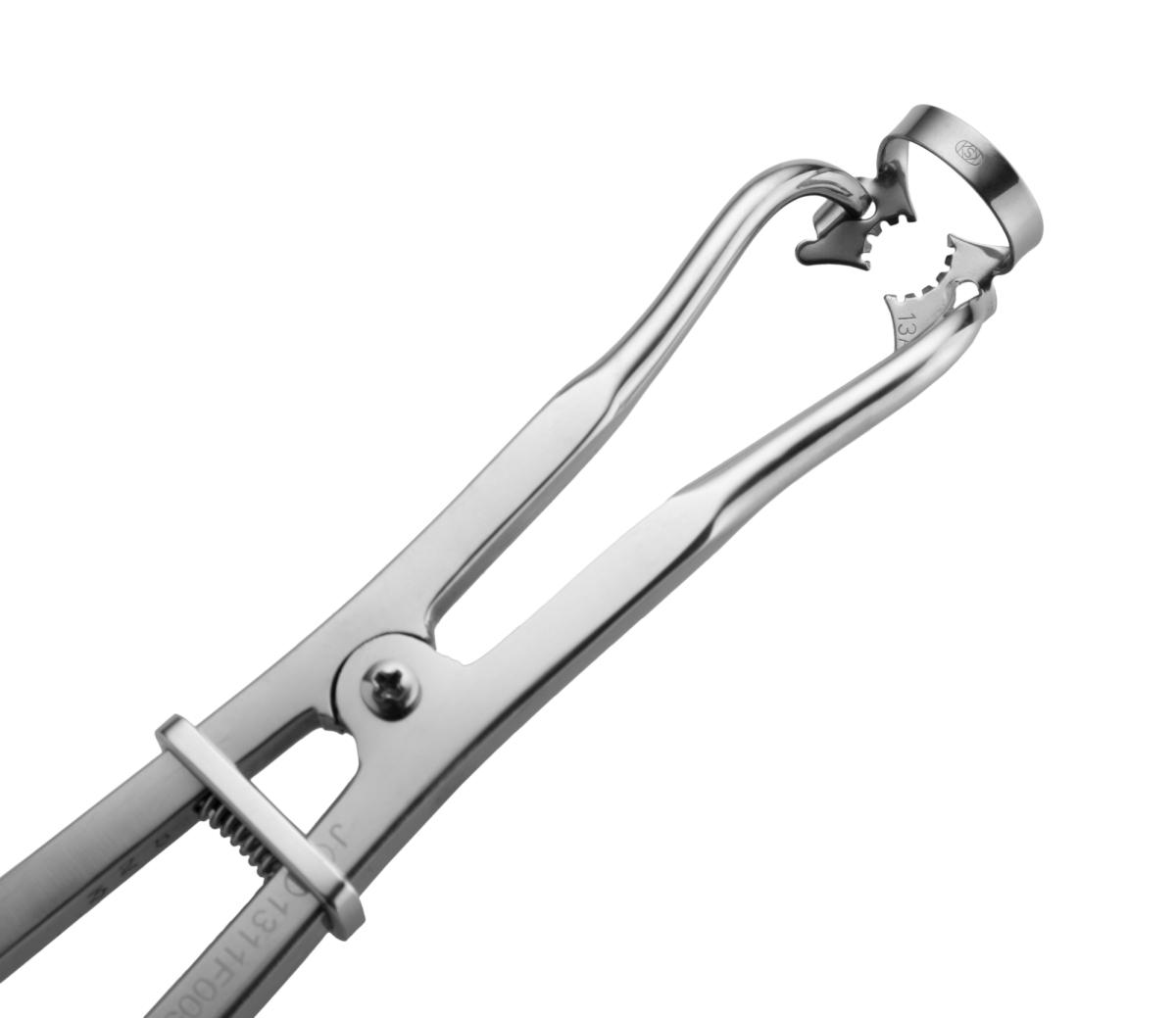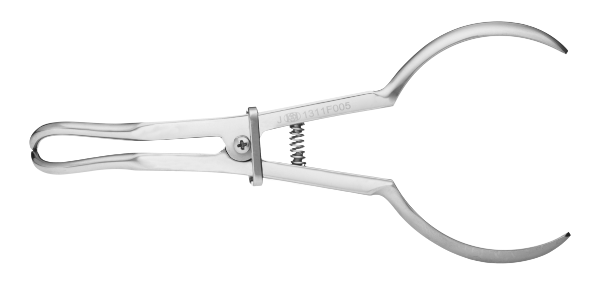 Стальные щипцы для установки клампов коффердам удобно фиксируются в ладони и надежно удерживают в растянутом положении любой кламп. Для снижения физической нагрузки в процессе установки клампов на изолируемые зубы, на щипцах имеется рамка-фиксатор, свободно передвигающаяся по ручкам щипцов между их изгибом и центральным фиксирующим винтом.